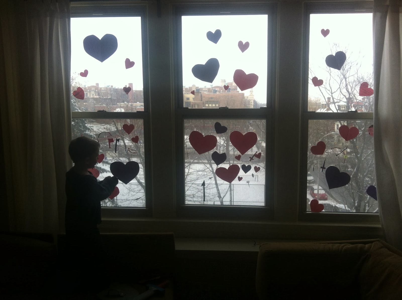 I've married into that family. I'm cutting out hearts with Christian to put up in our window (this is my annual attempt at crafts). Christian wanted to help and soon we were both cutting away. When Christian finished his first heart he thought it looked more like a helmet. Soon he was asking me for swords, spears, and axes. Now we have a window of hearts . . . and weapons.